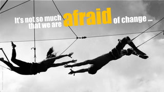 The document discusses change management and the differences between change (objective facts with timelines) and transition (subjective internal experiences). It notes that transition starts with individual awareness of ending and can be supported through understanding individual behaviors when faced with change. Resistance is a natural reaction to change, and performance over time follows a pattern from unawareness to acceptance as change is implemented. An organization's approach to transformation and transition support impacts how quickly it can take advantage of changes.