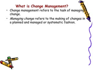 Change management involves systematically managing and implementing changes within an organization, emphasizing the importance of stakeholder involvement and clear communication. Successful change management can result in reduced resistance, increased efficiency, and improved organizational adaptability. Strategies for effective change management include education, participation, and utilizing frameworks like the ADKAR model and Kotter's eight-step process, alongside fostering a culture that supports change.