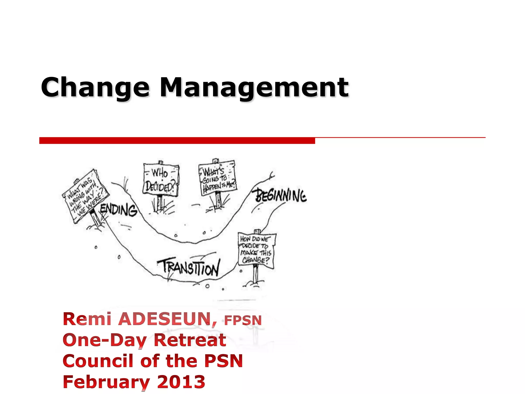 The document provides an overview of change management, emphasizing the need for careful planning and execution to navigate organizational changes effectively. It outlines key questions regarding the 'what, why, how, who, and when' of change management, along with best practices and common pitfalls. Additionally, it highlights the psychological aspects of change for individuals and stresses the importance of stakeholder involvement and leadership commitment.