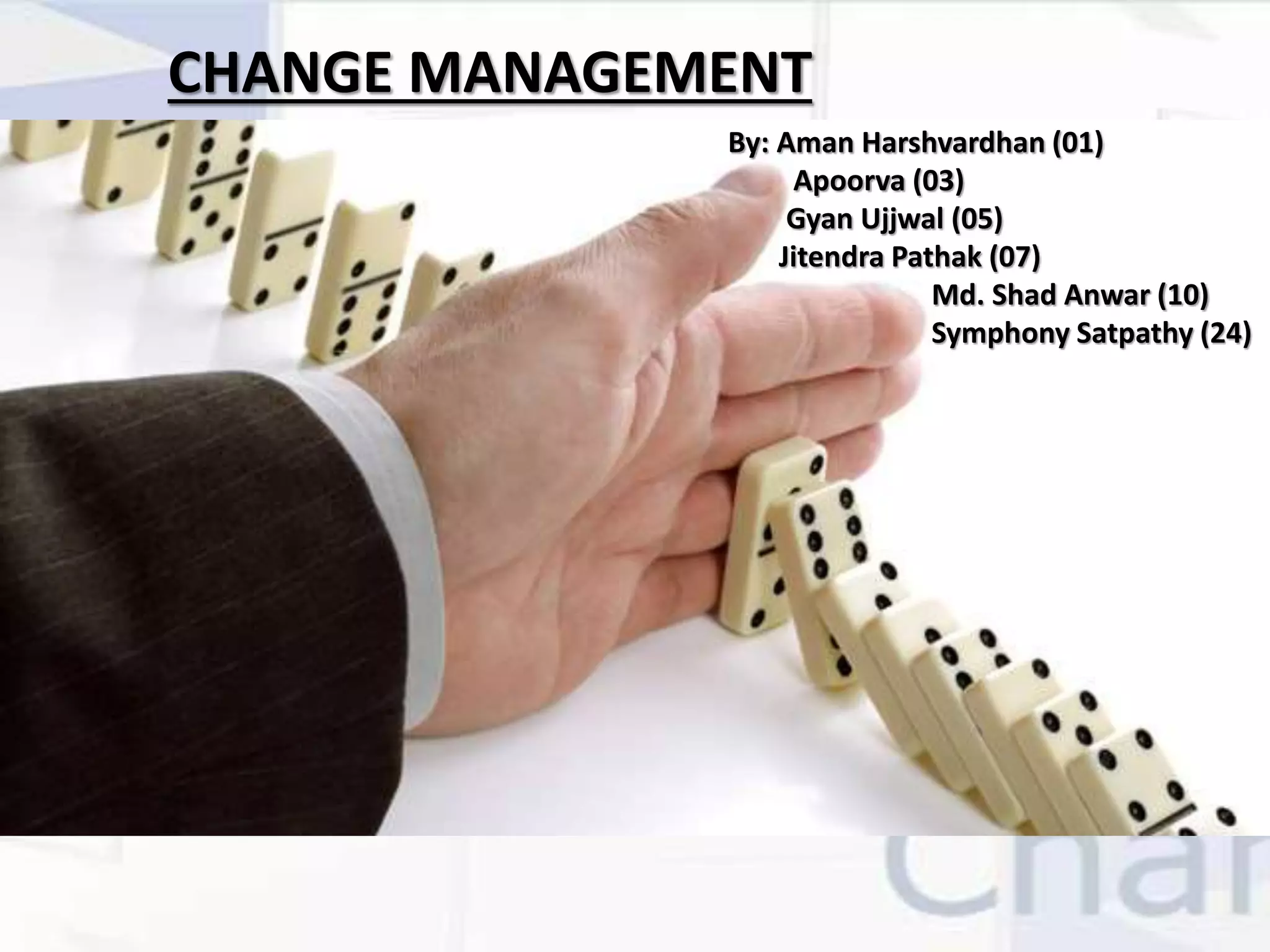 Change management is a systematic approach to dealing with change at both the organizational and individual level. It involves adapting to change, controlling change, and effecting change. There are different types of change like structural, cost cutting, process, and cultural change. There are also two main theories of change - Theory E which focuses on rapid shareholder value and cost cutting, and Theory O which emphasizes employee participation and building bonds between the enterprise and employees. For change to be successful, an organization needs to be change-ready by having respected leaders, personally motivated employees, and a non-hierarchical collaborative culture. Key steps to managing change include assessing change-readiness, developing participative approaches, giving employees a voice, and driving out fear.