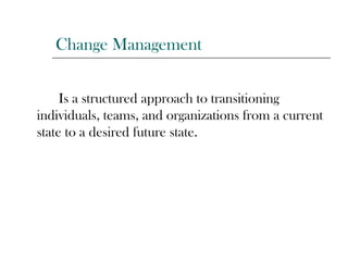 Change management is a structured approach to transitioning organizations from their current state to a desired future state. There are several models of change management including Lewin's unfreeze-change-refreeze model, the ADKAR model with its five building blocks, and dynamic conservatism which explores an organization's inherent resistance to constant change. Organizational change management includes processes for managing the human aspect of change through techniques like creating change strategies, engaging leaders, building awareness, and sustaining changes.