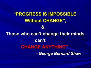 The document discusses the importance of change management within organizations, emphasizing that adaptability to change is crucial for survival. It outlines the forces driving change, reasons for resistance, and strategies for effectively implementing change, highlighting the roles of managers as change agents. Key cultural issues, communication strategies, and the necessity of gradual transitions are also addressed to facilitate successful organizational change.