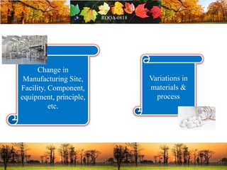 This document discusses change management in pharmaceutical manufacturing, emphasizing regulatory compliance and real-world impacts of changes in processes, equipment, and materials on product quality. It highlights the need for effective quality management systems, proper risk assessment, and ongoing evaluation to ensure safety and regulatory adherence. Various case studies illustrate the severe consequences of inadequate change control, underscoring the importance of maintaining a state of control throughout the product lifecycle.