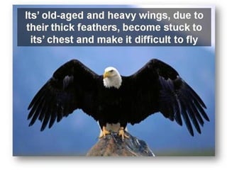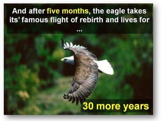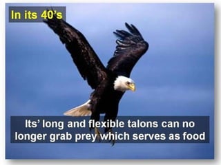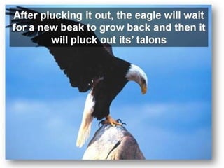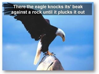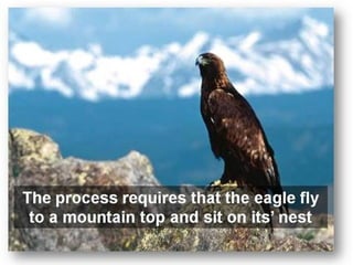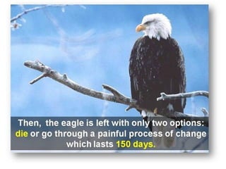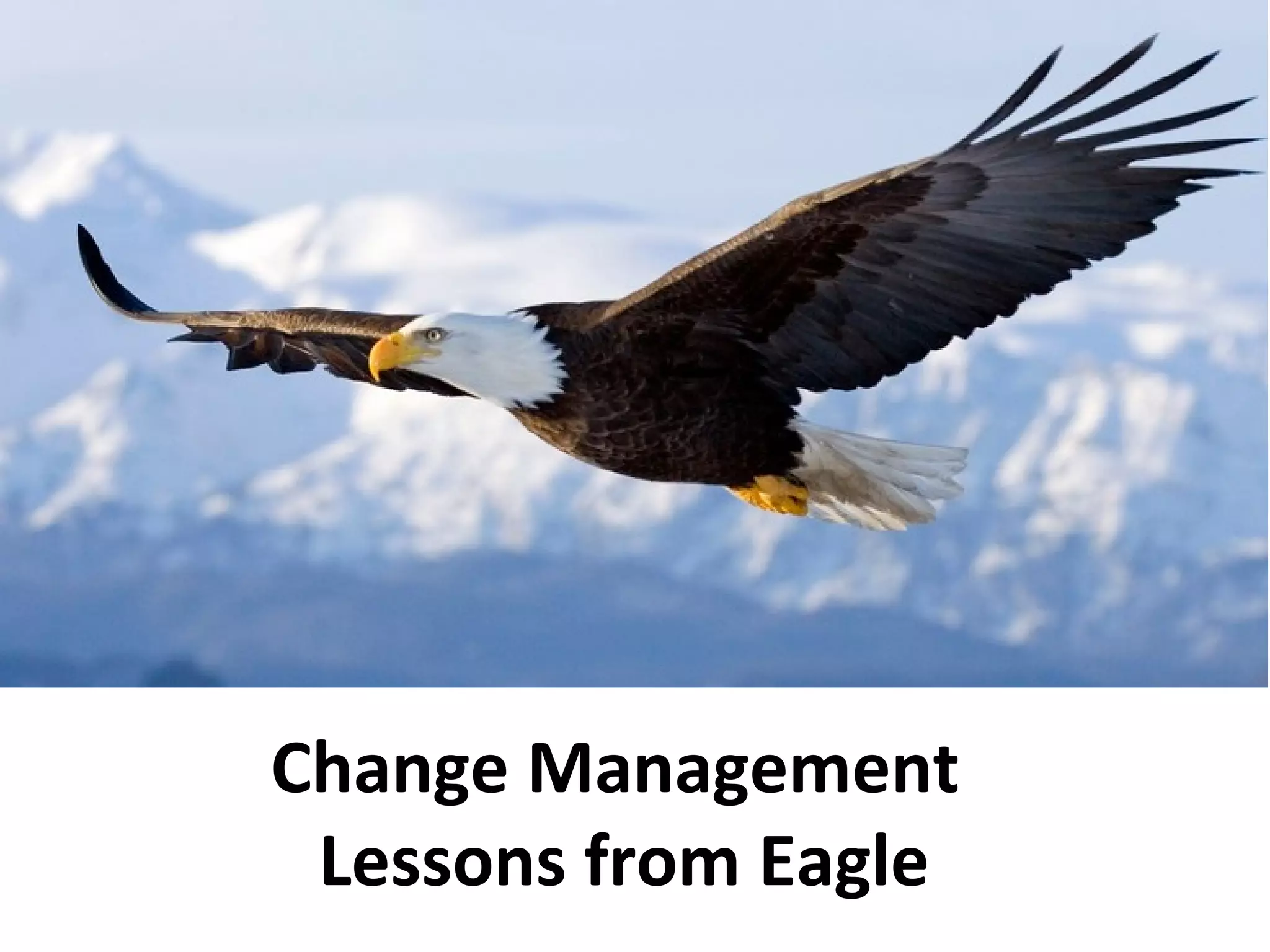 Change management is important for organizations to adapt to new challenges. Lessons can be learned from how an eagle teaches its young to fly by gradually increasing the challenges and allowing failures along the way. This document appears to discuss change management lessons learned from how eagles teach their young to fly.