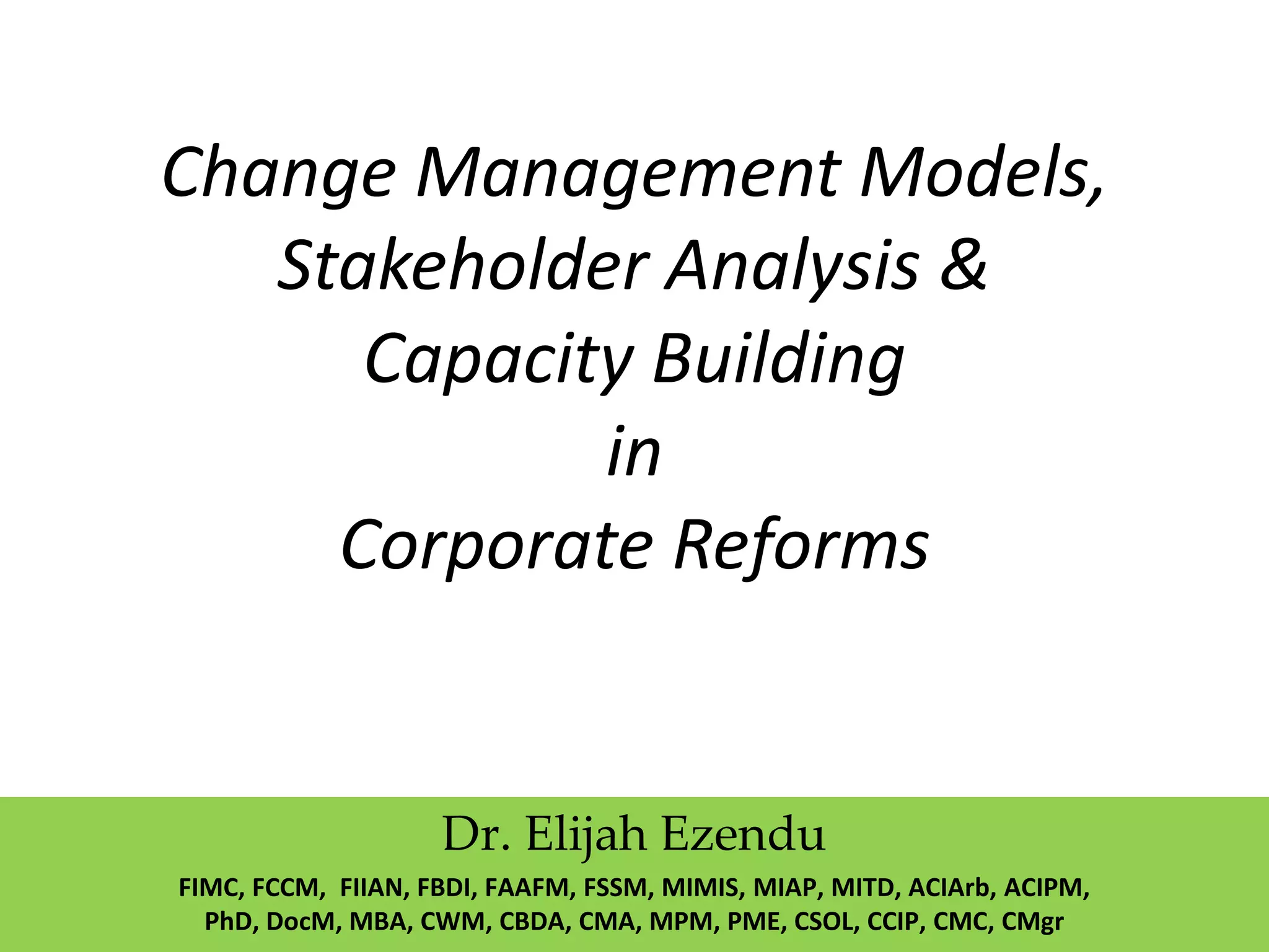 The document outlines various change management models and processes, including Lewin's model, Kotter's 8-step process, and the ADKAR change model, emphasizing the importance of assessing stakeholders and building capacity for effective corporate reforms. It provides a structured approach to implementing change by identifying stakeholder interests and behavior while ensuring organizational readiness. The author, Dr. Elijah Ezendu, a seasoned business consultant, highlights the need for a culture supportive of change and the strategic involvement of stakeholders for successful outcomes.