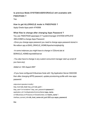 The document discusses using the FNDCPASS utility to change passwords for Oracle Applications schemas and the APPS schema. It introduces the new ALLORACLE mode added in patch 4745998, which allows changing passwords for schemas like AP, GL, and AR, as well as the APPLSYS and APPS schemas. The document provides instructions on using FNDCPASS and notes that other configuration files may need to be updated after changing the APPS password when using single sign-on or other integrated components.