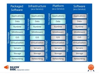 The document discusses the transition to cloud services through change management, emphasizing both psychological and technical factors that influence decision-making. It categorizes organizational types and their specific situations related to cloud versus on-premises solutions, highlighting the importance of infrastructure and financial considerations. Additionally, it addresses training requirements, user adaptability, and the complexities introduced by hybrid models.