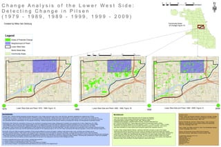 This document analyzes changes in the Lower West Side and Pilsen neighborhoods of Chicago between 1979 and 2009 using remote sensing data and GIS analysis. The author examines potential signs of urbanization, such as increasing population density and development, that could indicate gentrification. Change detection analysis was performed on Landsat imagery from 1979, 1989, 1999 and 2009 to identify areas of change. The results suggest increasing development in Pilsen over the 30-year period that could be affecting the neighborhood's demographic and cultural identity.