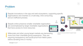 ChangeforCause is a startup that aims to create a frictionless process for donating to charities through a mobile app. The app allows users to round up debit/credit card purchases and donate the change to selected charities. It also provides rewards and social features to encourage donations. The founders are seeking $200,000 in funding to develop a public beta of the app and cover initial operating costs. Validation surveys found strong interest in the round-up donation concept and ease of use of a prototype app.