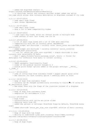 The document outlines the changelog for various versions of the Currency Switcher plugin from v1.0.0 to v2.2.1, detailing bug fixes, new features, and compatibility updates with WooCommerce and WordPress. Key improvements include new currency options, enhanced security measures, and additional shortcodes for user flexibility. Each version update includes specific dates and links to further information on the changes made.