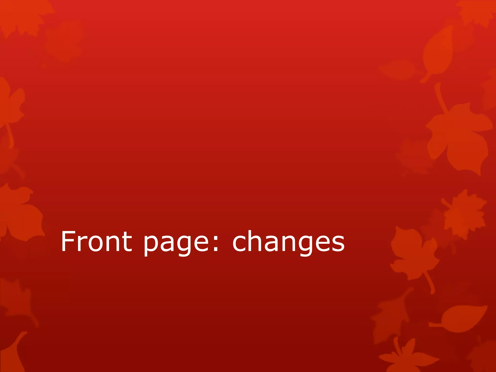 1) The document discusses changes made to the front page design of a magazine, including making the main text bolder and changing its color to better fit the color scheme and attract the target audience.