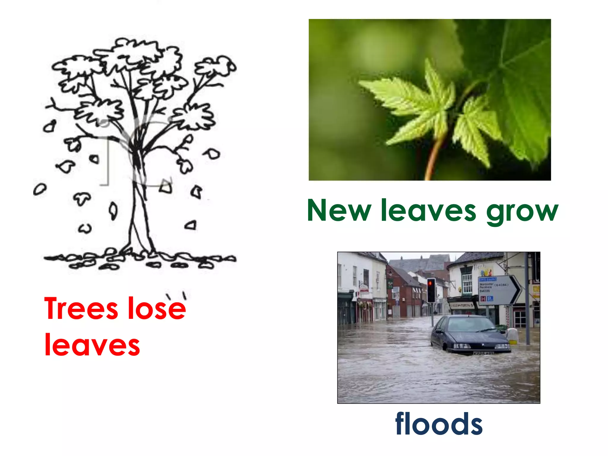 The document discusses natural changes like trees losing leaves, new leaves growing, rain, floods, earthquakes, winds, and droughts. It also discusses artificial changes from human activities such as building cities, farms, dams, mining, and electrical power lines which can cause disasters from fires, floods, and droughts.