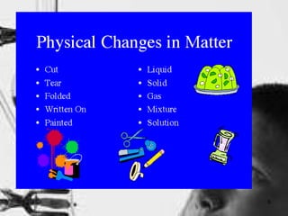 A physical change alters a substance's form or appearance but not its chemical composition, such as water freezing to ice. A chemical change creates new substances through molecular rearrangement, like iron rusting due to oxidation. Chemical changes can be identified by changes in properties such as density, melting point, or reactions producing gas.