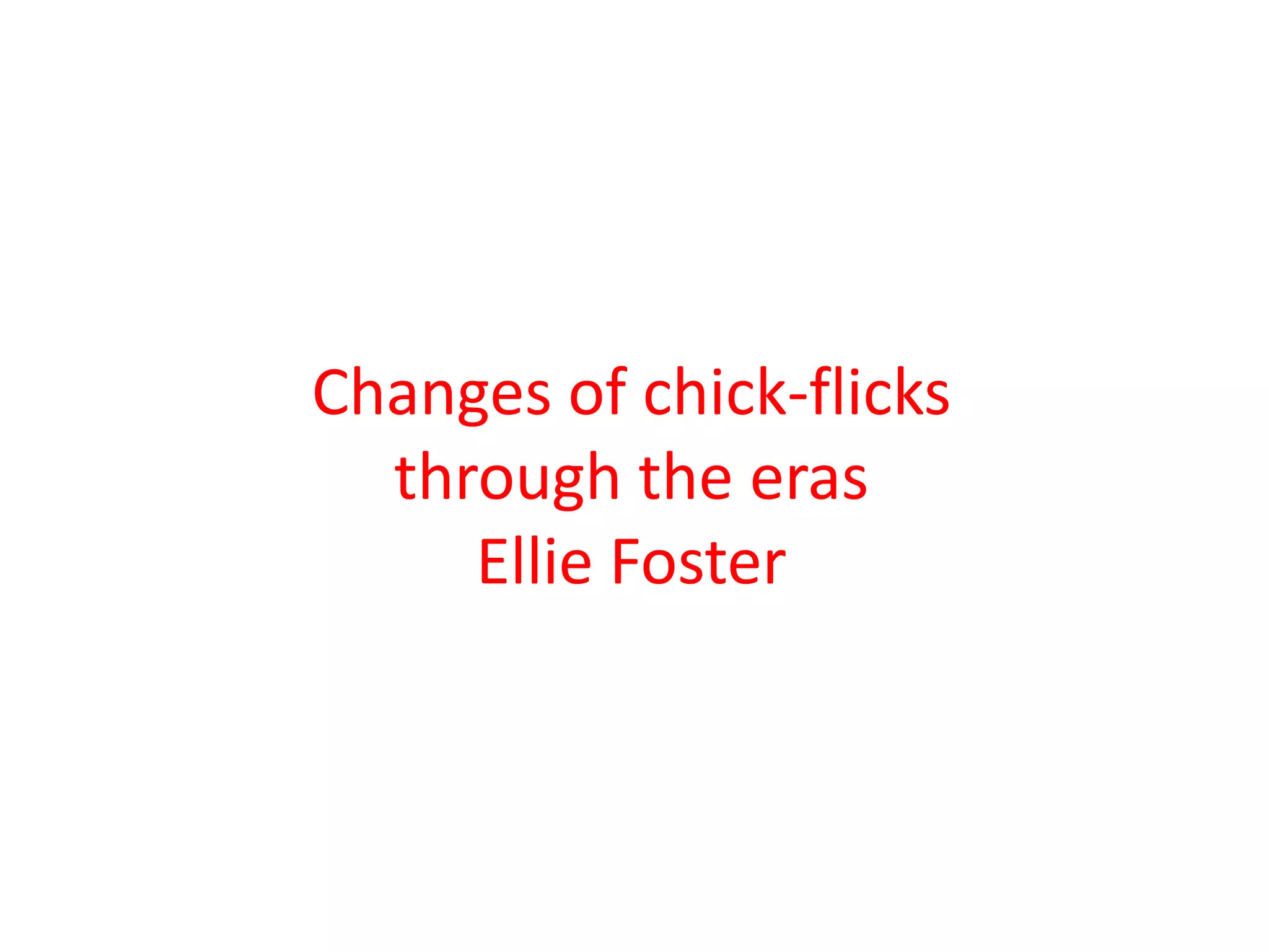 This document summarizes chick flicks from different eras, including the 1920s-1980s. It provides plot summaries and key details about films such as "Why Change Your Wife?", "The Flapper", "Morocco", "The Divorcee", "Notorious", "The Philadelphia Story", "How to Marry a Millionaire", "All About Eve", "Breakfast at Tiffany's", "Alice Doesn't Live Here Anymore", "Love Story", and "Smooth Talk". The document discusses how the films appealed to female audiences and changing themes in chick flicks over time.