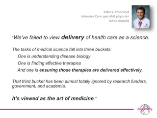 The document discusses the importance of implementation science in healthcare, emphasizing that understanding and applying evidence-based practices is crucial for improving patient outcomes. It outlines barriers and facilitators to effective intervention delivery, as well as strategies to promote successful adoption and sustainability of new practices in the operating theatre. Additionally, it highlights the need for collaboration across departments and provides a structured approach to implementing change through Kotter's 8-step model.