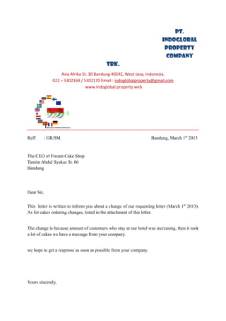 The CEO of Indoglobal Property Company wrote a letter to inform the CEO of Frozen Cake Shop that they are changing their previous cake order from March 1st. The amount of customers staying at their hotel has increased, so they need to order more cakes than previously requested. They provide an attachment listing the new quantities of 8 types of frozen cakes needed. They request a prompt response from the cake shop regarding the changed order.