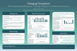 This document summarizes research on training programs for seasonal educators at museums. It finds that while most museums have initial training programs, the training is often brief and insufficient due to limited time and resources. It also finds that training programs typically focus more on interpretation techniques than other important topics. The researcher argues that training programs need to shift to a reconceptualized, cyclical model with ongoing development opportunities to better prepare seasonal educators.