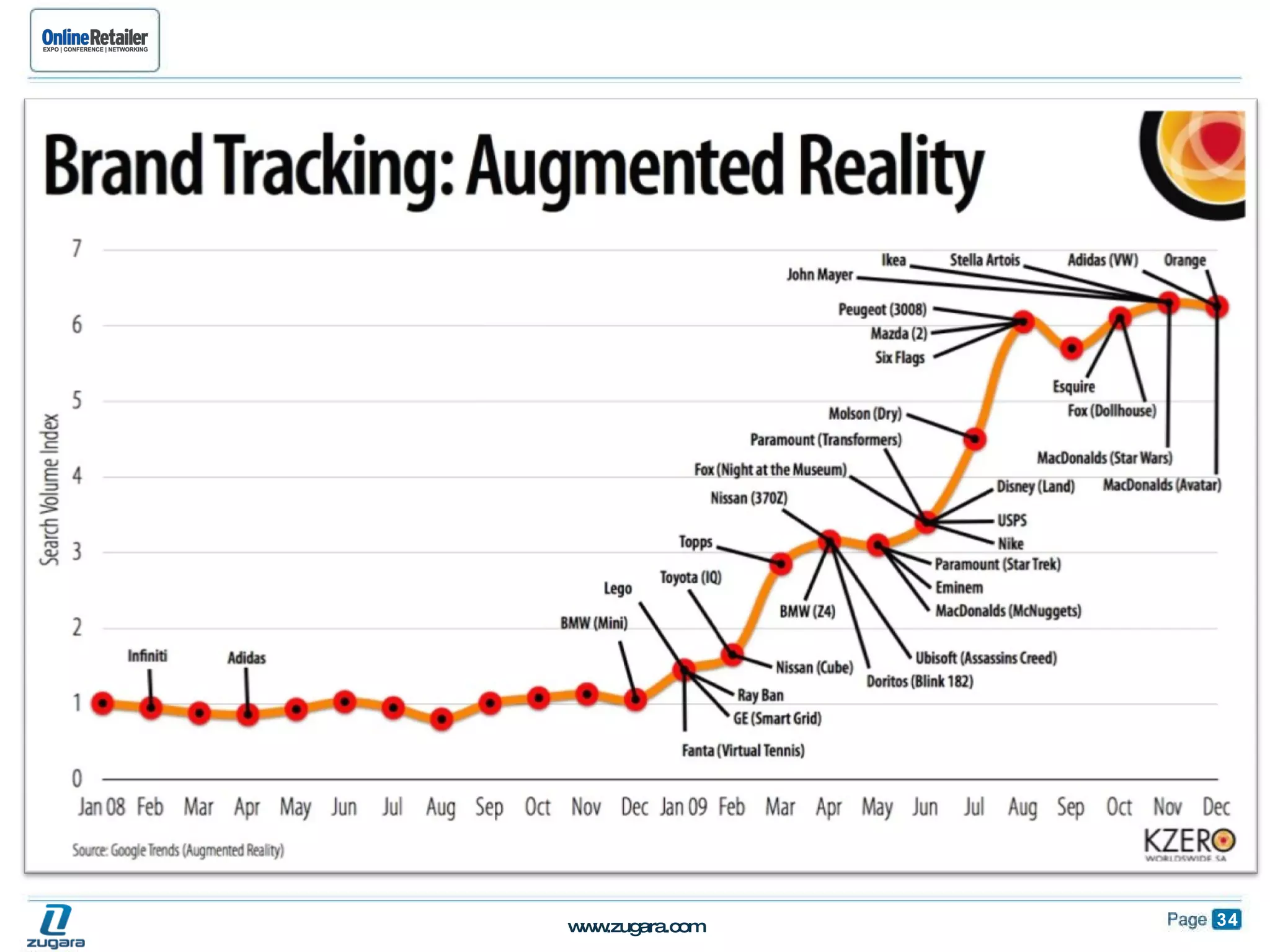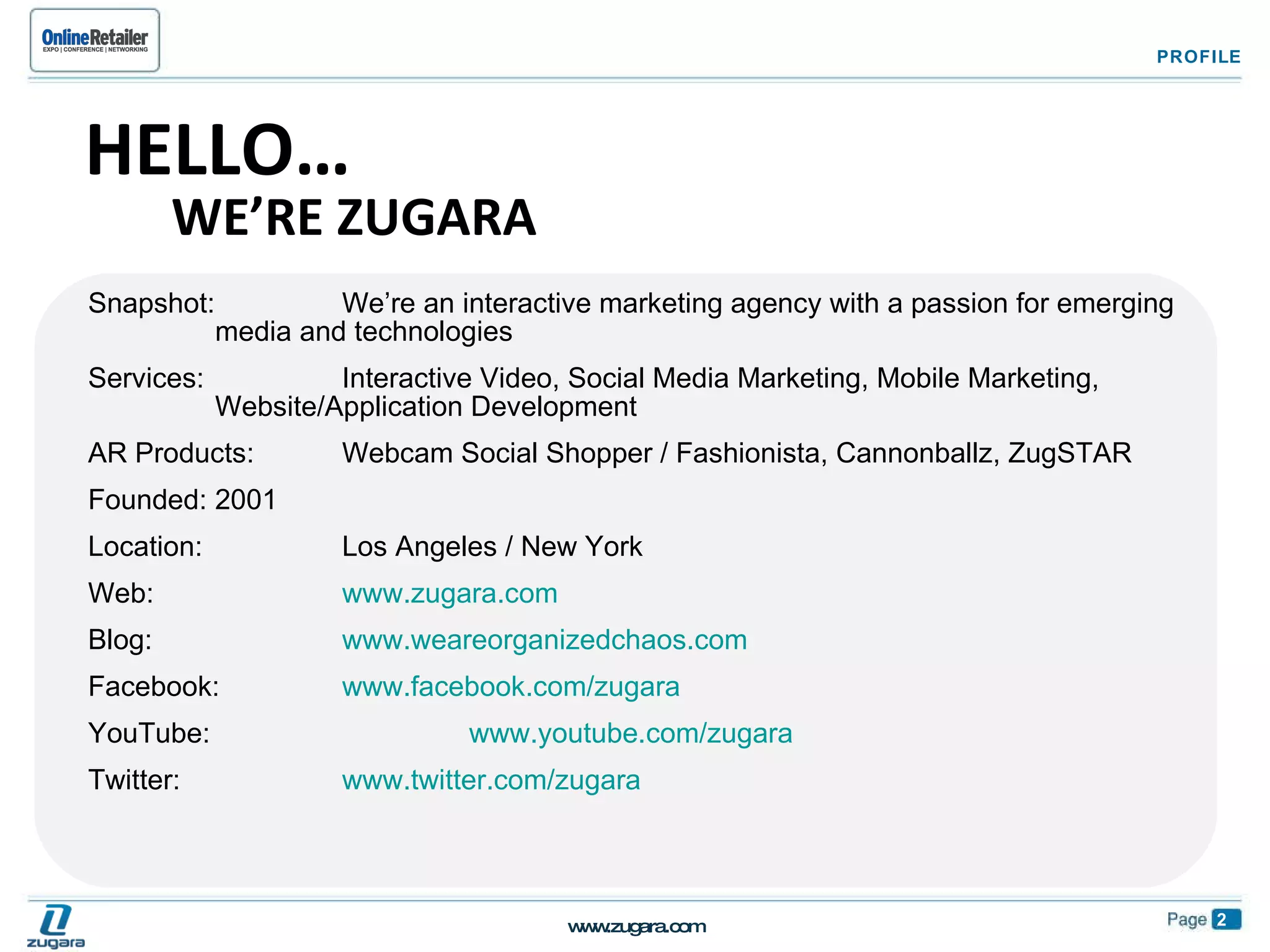 Zugara, an interactive marketing agency founded in 2001, focuses on emerging technologies like augmented reality (AR) and interactive video to enhance e-commerce experiences. The document discusses the growing importance of social media and peer influence on online shopping, highlighting key statistics about consumer behavior and engagement. It emphasizes the need for innovative solutions, such as AR, to bridge the gap between the convenience of online shopping and the emotional, social aspects of in-store experiences.