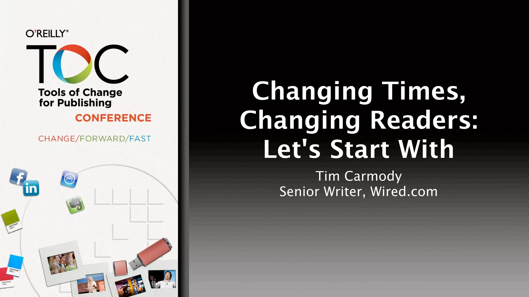 The document discusses the evolution of reading over time through various technological innovations from 1850 to the present. It explores how each new medium from newspapers to movies to computers changed expectations of what reading entails and how text can be experienced. While e-books brought changes, they have not revolutionized reading like prior innovations. The most important expectations for reading involve quantity of content available rather than qualitative aspects of the reading experience. Constraints that initially seem limiting can become freeing over time as new standards and skills develop.