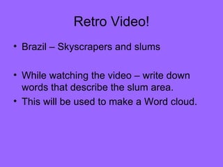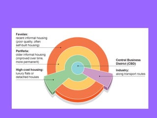 Shanty towns, also known as squatter settlements, have emerged in many large cities in developing countries due to large numbers of people migrating from rural to urban areas. They are characterized by makeshift housing built from scrap materials and lack adequate facilities. Common problems associated with shanty towns include diseases from poor sanitation, hazards from unstable housing, and social and political issues. Some governments have tried relocating residents but with limited success. Improved approaches involve communities in planning and building new housing.