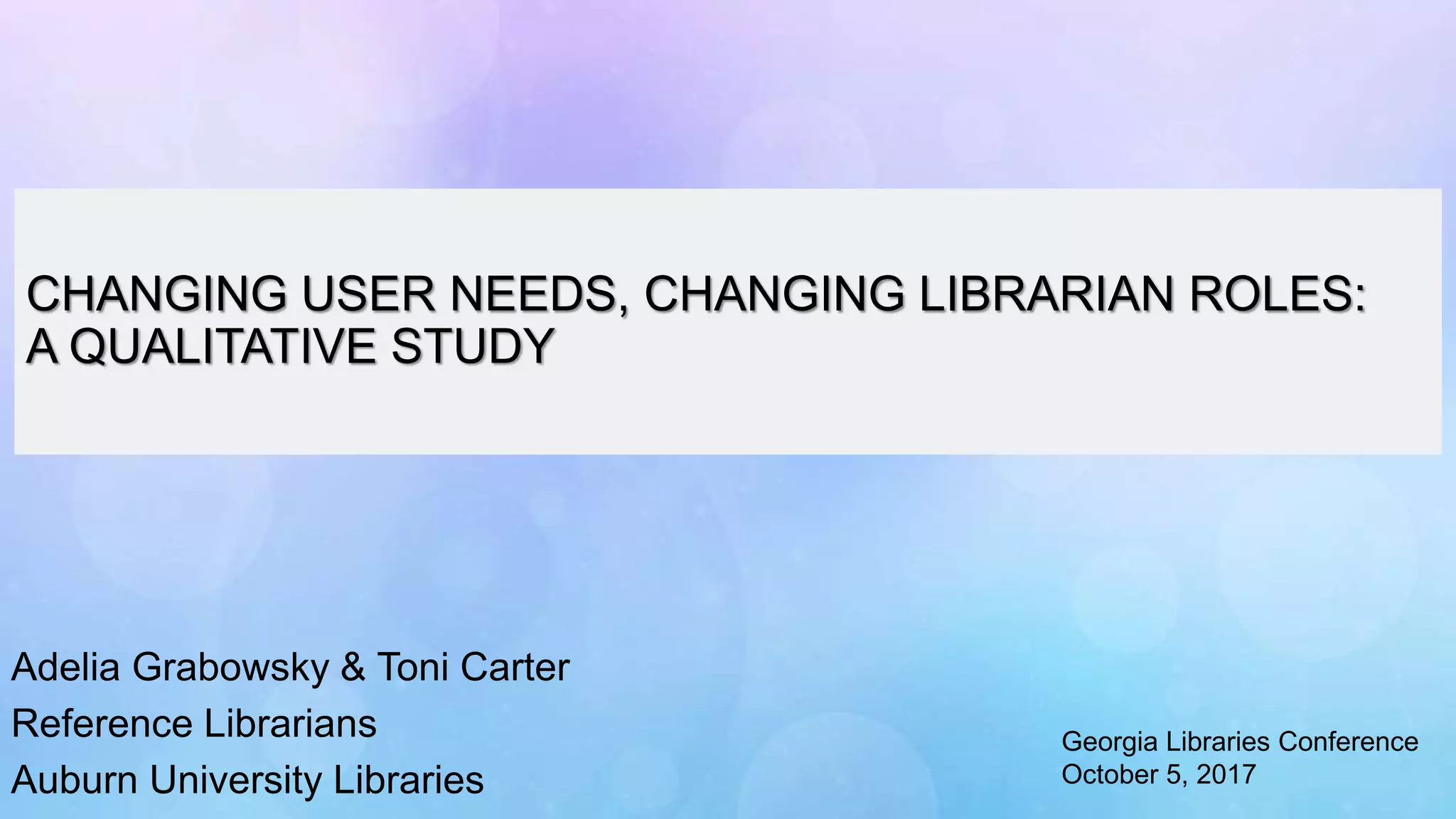 The document presents a qualitative study on the evolving roles of librarians and changing user needs at Auburn University Libraries, highlighting themes such as the need for subject specialists, the importance of relationship building with faculty, and the emergence of overlapping services. The study includes insights gathered from focus group discussions among reference librarians, identifying gaps in subject areas and suggesting the development of resident experts and collaborative teams to address the challenges faced. It concludes with recommendations for hiring practices, skill assessments, and further discussion on the library's role on campus.