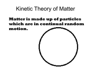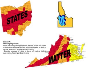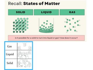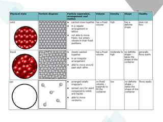 The document outlines learning objectives for understanding the properties and states of matter, including solids, liquids, and gases, as well as changes of state such as melting and boiling. It introduces kinetic particle theory to explain the behavior of matter under varying temperature and pressure conditions, and discusses the concept of pure substances and diffusion. Additionally, the document provides links to simulations and videos for further exploration of these topics.