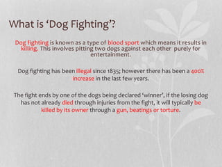 Dog fighting involves pitting dogs against each other for entertainment and gambling purposes. It has been illegal in the UK since 1835 but reports of dog fighting have increased 400% in recent years. To train dogs for fighting, they are often starved, beaten, and made to do strenuous exercise to encourage aggression and build endurance. The documentary showed footage of dog fights to the RSPCA to help investigate illegal dog fighting and identify those involved. Many viewers commented anger at the sport, calling it barbaric and saying those who participate should face imprisonment.