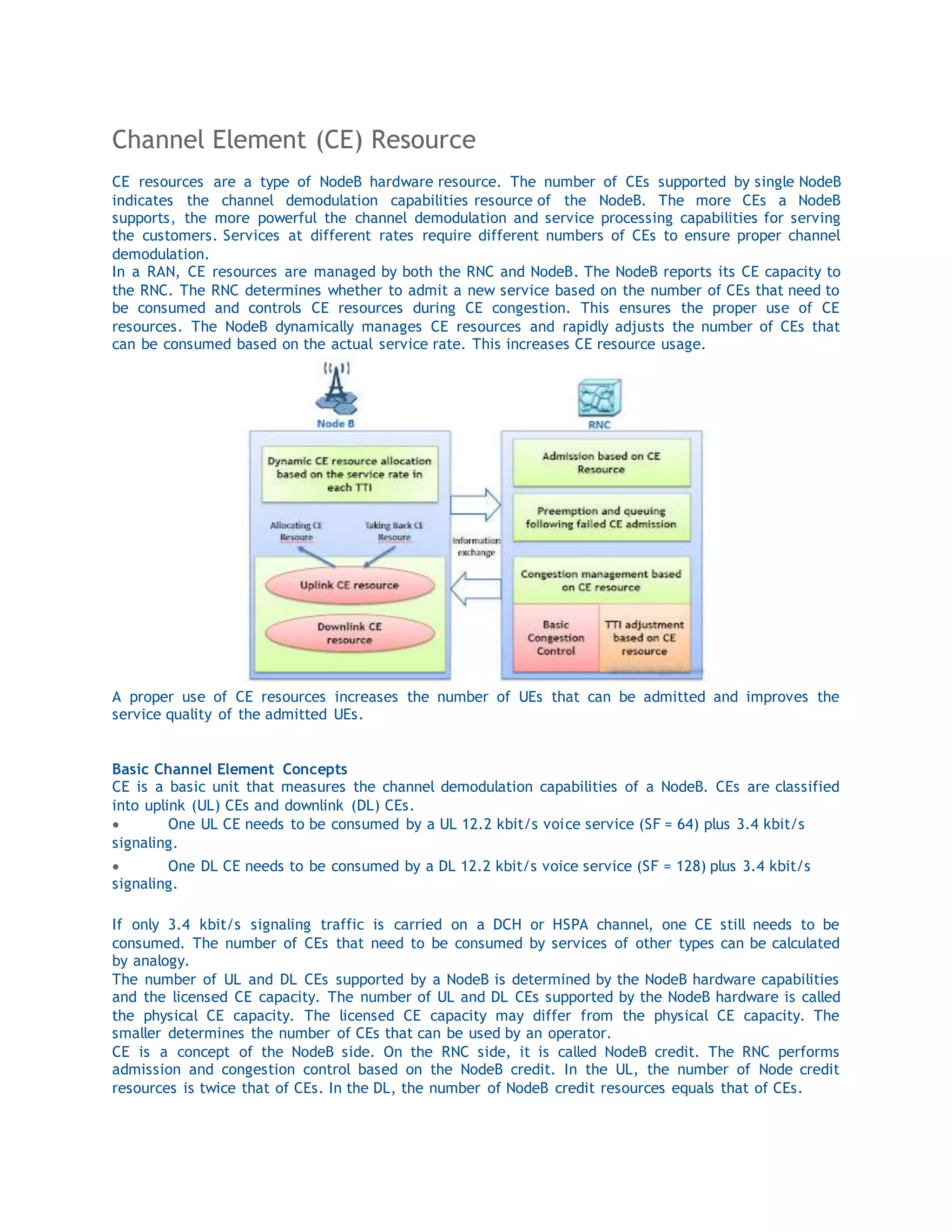 CE resources are a type of hardware resource in NodeBs that measure channel demodulation capabilities. The number of CEs supported by a NodeB determines how many users and what types of services it can support. CEs are managed jointly by the RNC and NodeB to ensure resources are used properly. The number of CEs consumed depends on the type of service and can be calculated based on mappings provided in the document.