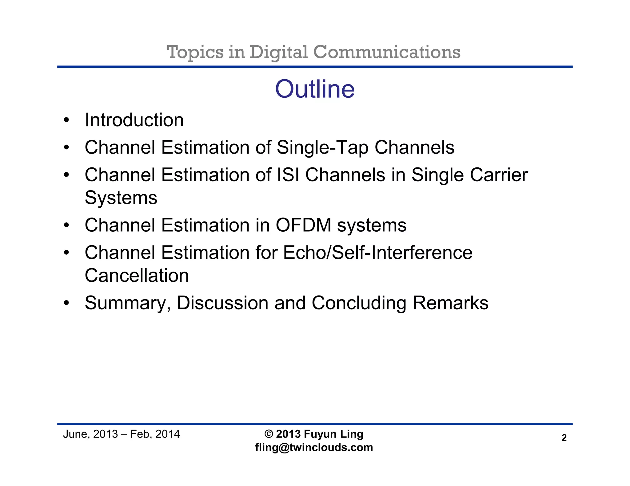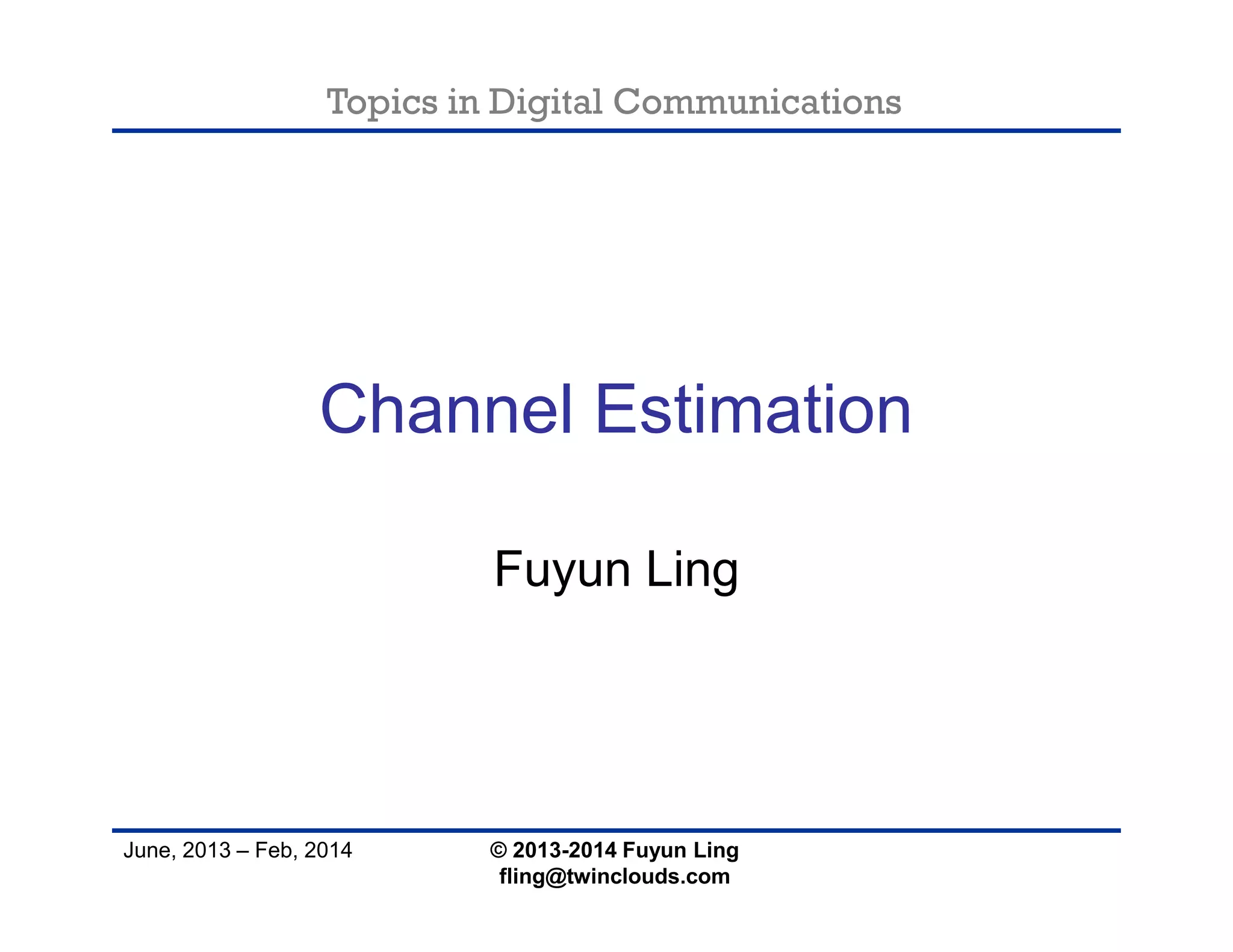 This document describes a course on topics in digital communications from June 2013 to February 2014. The course covers channel estimation techniques for various channel models, including single-tap channels and intersymbol interference channels. It discusses estimating channel coefficients using pilot symbols and maximum likelihood estimation. Channel estimation is applied to tasks such as symbol demodulation, equalization, and echo cancellation.