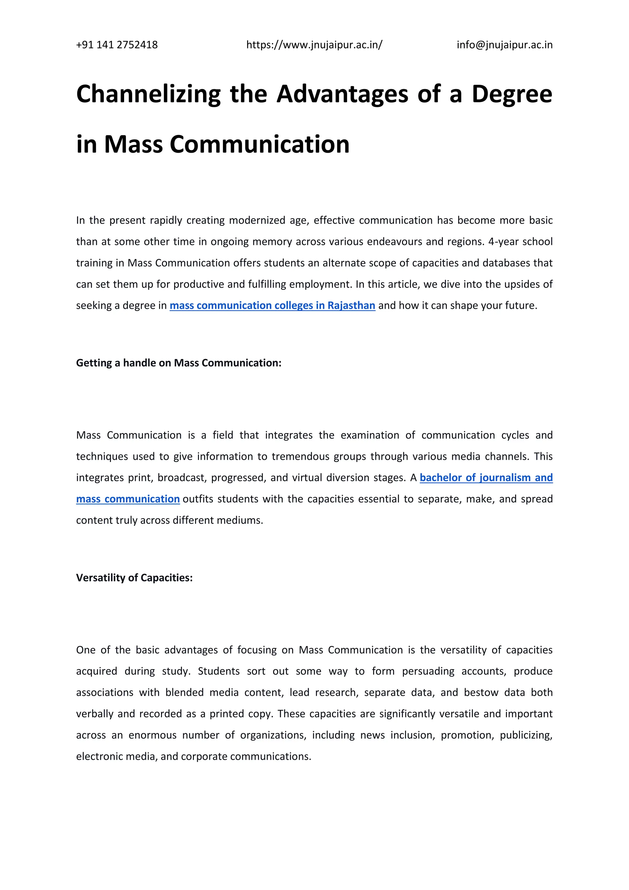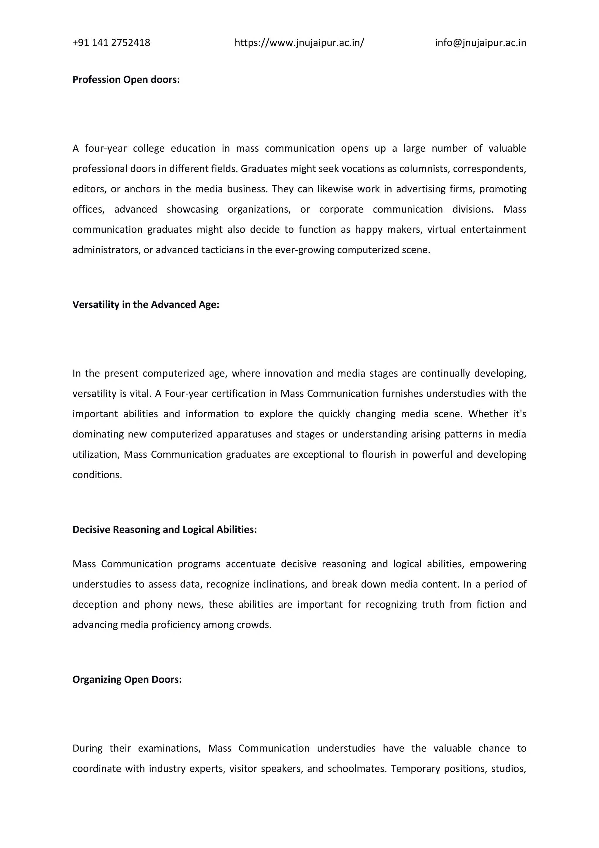 A four-year degree in mass communication equips students with essential skills for effective communication across various media channels and industries. Graduates have diverse career opportunities in media, advertising, and digital content, and the program emphasizes critical thinking and creativity. Additionally, it fosters social awareness and networking opportunities to prepare students for a dynamic and interconnected world.
