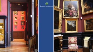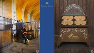 The Château de Chantilly offers visitors many grand rooms to explore, including the parterre gardens designed by Le Nôtre in the late 17th century which provide stunning views. The library contains over 44,000 books and 1,500 manuscripts. Various rooms in the château showcase different eras through their furnishings, like the Monkey Room from 1737 and the Grand Cabinet Corner from 1720. Other notable rooms include the Picture Gallery, Rotonde, Great Stables built for the Prince of Condé in the 18th century, and the chapel housing the hearts of the Princes of Condé.