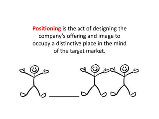The document discusses brand positioning and differentiation strategies. It explains that positioning involves designing an offering and image to occupy a distinctive place in the mind of the target market. Points of difference and parity are defined, with criteria for points of difference being relevance, distinctiveness, believability, feasibility, communicability and sustainability. Differentiation strategies can involve product, personnel, channel or image. The document then covers product life cycle claims and marketing strategies for different stages, including introduction, growth, maturity and decline.