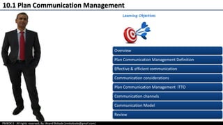 Chapter 10 of the PMBOK 6th edition details the processes involved in project communication management, emphasizing the importance of planning effective and efficient communication strategies based on stakeholder needs. It outlines inputs, tools, techniques, and outputs relevant to developing a comprehensive communication management plan that facilitates information flow among project stakeholders. Key considerations include communication methods, requirements analysis, technology, and the roles of interpersonal skills in ensuring clear and effective communication.