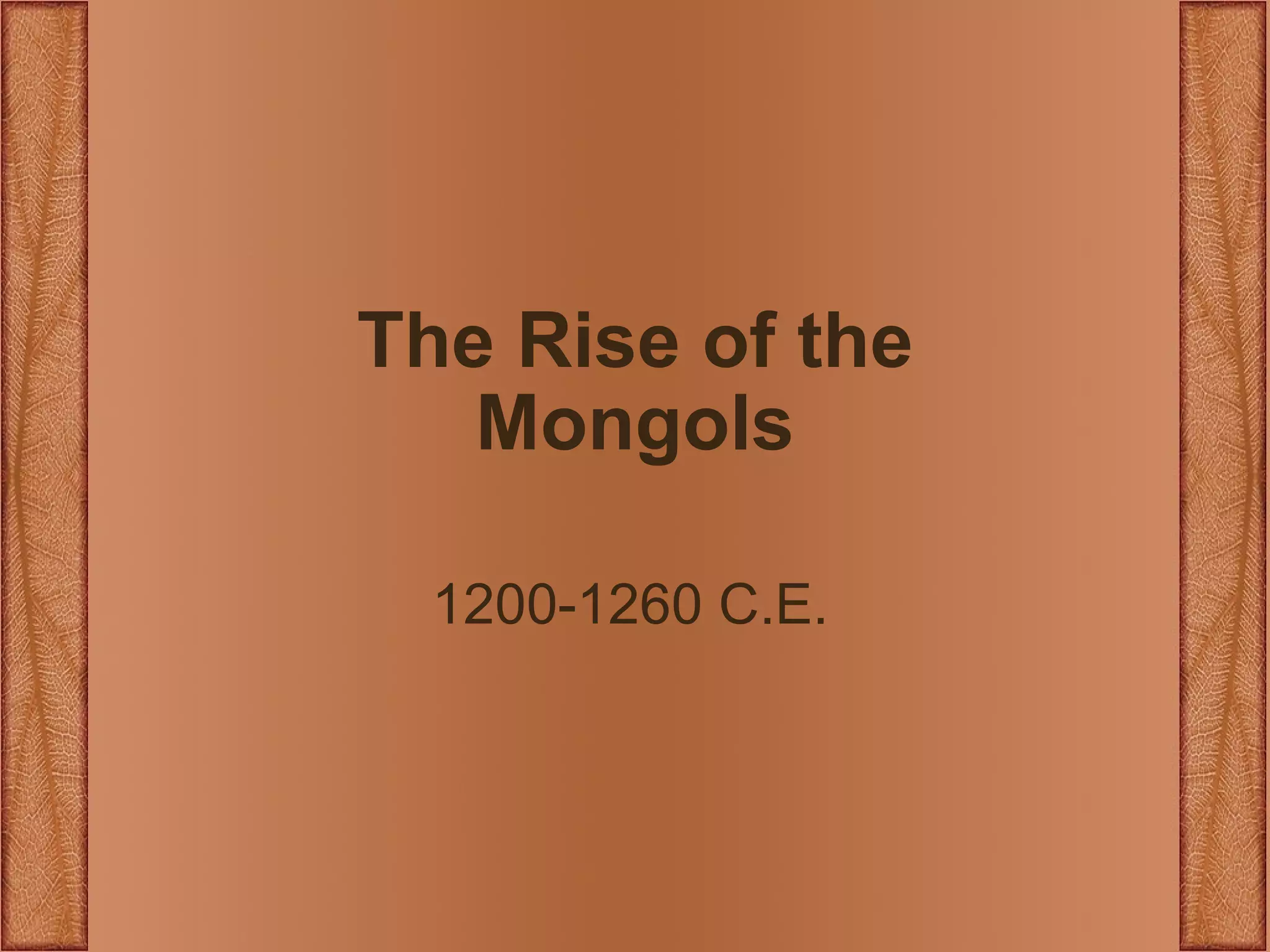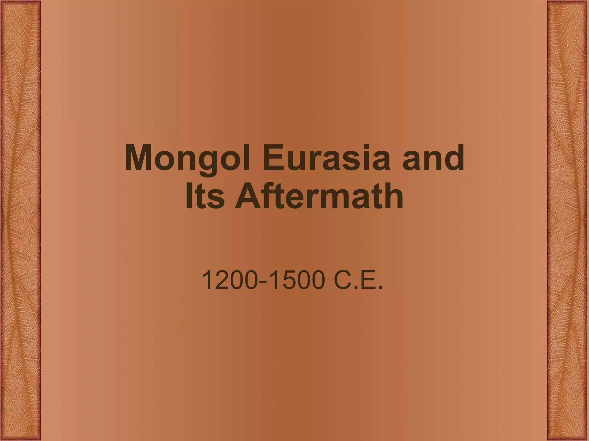 The document outlines the rise and influence of the Mongol Empire from 1200 to 1500 CE, detailing their nomadic lifestyle, conquests, and remarkable military tactics. It discusses the Mongol's interactions with various cultures and religions, the economic implications of their conquests, and the resulting spread of trade and knowledge. Additionally, it covers the eventual decline of Mongol power and the establishment of subsequent states in regions such as China, Korea, and Vietnam.