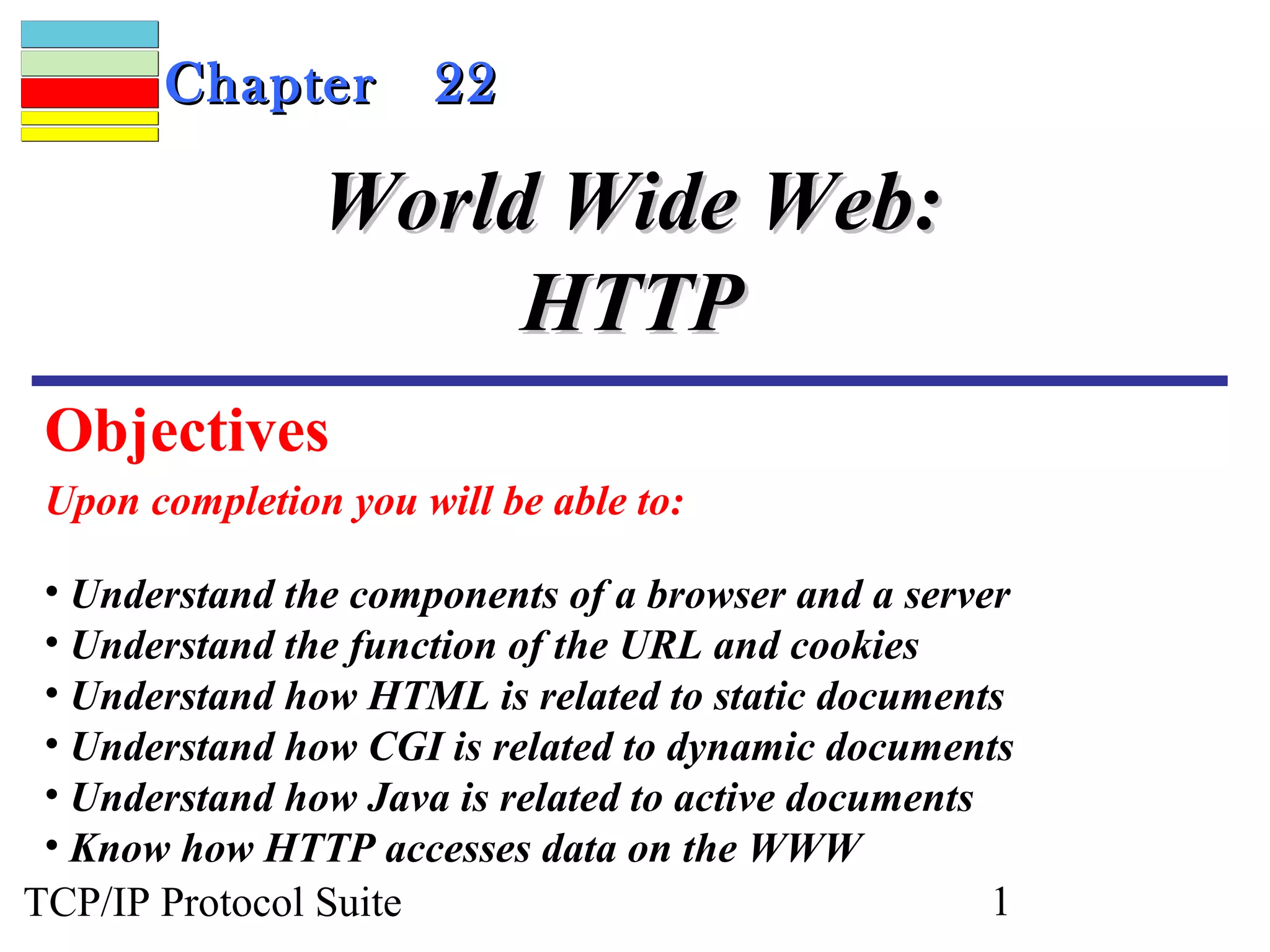 The document discusses the architecture and components of the World Wide Web and HTTP. It covers clients (browsers), servers, URLs, cookies, and the three categories of web documents: static, dynamic, and active. It also explains HTTP transactions, including request and response messages, status codes, headers, and examples of GET and POST methods. Key concepts covered are browsers, servers, URLs, cookies, static documents using HTML, dynamic documents using CGI and scripts, active documents using Java applets and scripts, and the functioning of HTTP.