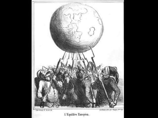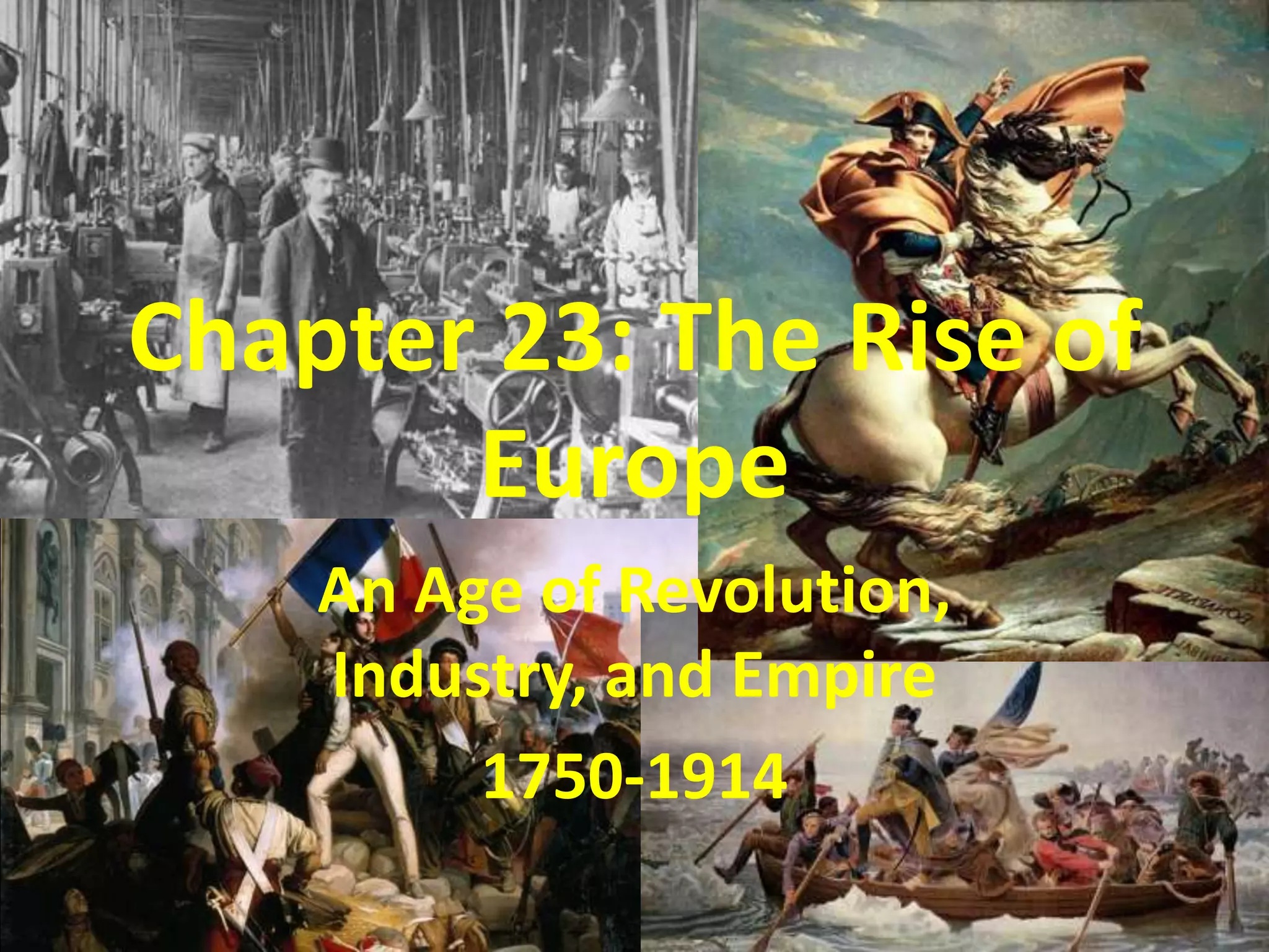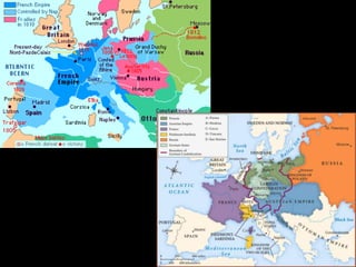 The document summarizes major events in Europe from 1750-1914, including the Enlightenment, the American and French Revolutions, and the rise of new ideologies like conservatism, liberalism, and radicalism. It also discusses the unification of Italy and Germany in the 19th century. Key figures discussed include Locke, Voltaire, Rousseau, Napoleon, Cavour, Garibaldi, and Bismarck. The document traces the development of nationalist ideas and how they contributed to the formation of modern European nation-states.