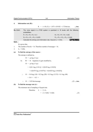 This document contains solved examples related to information theory. It begins with examples calculating the information rate of a telegraph source with dots and dashes. It then provides examples calculating the entropy, message rate, and information rate of a PCM voice signal quantized into 16 levels. Further examples calculate the source entropy and information rate for a message source that generates one of four messages. Finally, it constructs the Shannon-Fano code for a source with five symbols of varying probabilities.