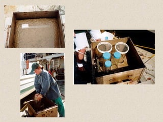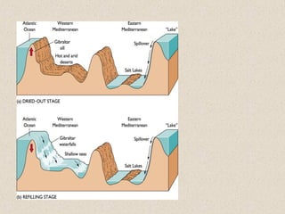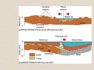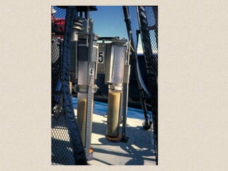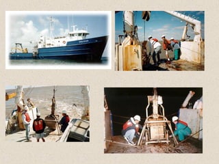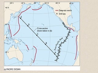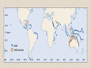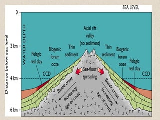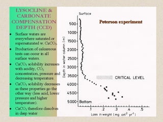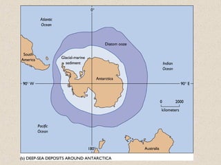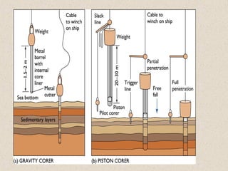Marine sediments originate from various sources including weathering of continents, volcanic eruptions, biological activity, and chemical processes. Sediment classification is based on grain size and composition. Coarser sediments indicate higher energy depositional environments while finer sediments like silts and clays indicate lower energy. Biogenic sediments are composed of marine microfossil remains while authigenic sediments form from chemical precipitation in seawater. The majority of sediments accumulate on continental margins with the thickest deposits along coastlines that receive river and glacial inputs and thinner deposits in the deep ocean basins.