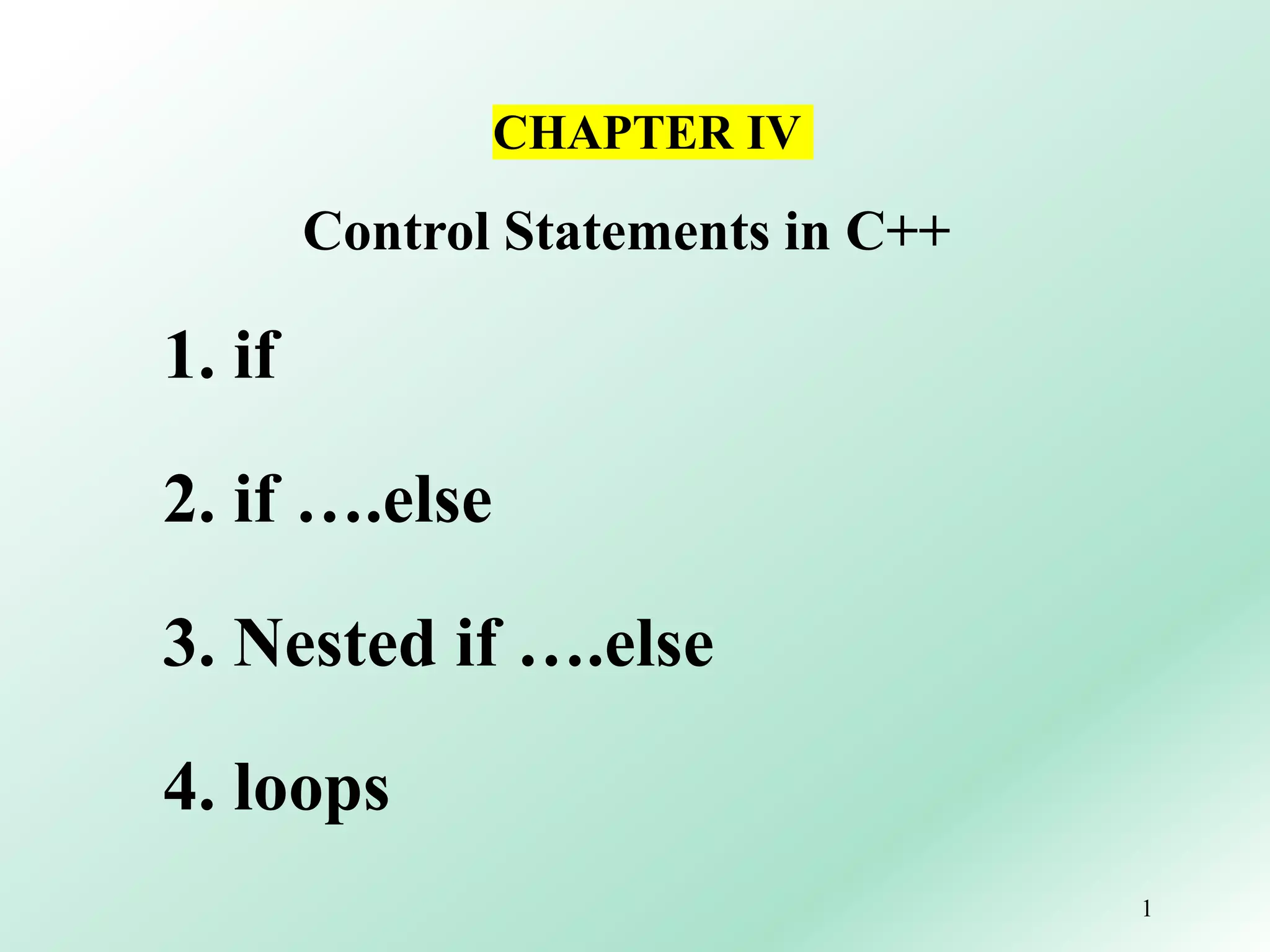 The document discusses control statements in C++, specifically if, if-else, and nested if-else statements. It provides examples of each type of if statement and how they work. The key points are: