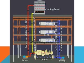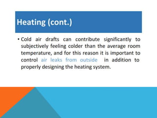 The document discusses heating, ventilation, and air conditioning (HVAC) systems and indoor air quality. It describes how HVAC systems work and the components involved, including the refrigeration cycle, air handling units, ducting, and different system types like window units, split units, and central air conditioning. It also discusses factors that affect indoor air quality like temperature, humidity, airflow, and maintenance of HVAC equipment. Poor indoor air quality can cause health issues and impact productivity.