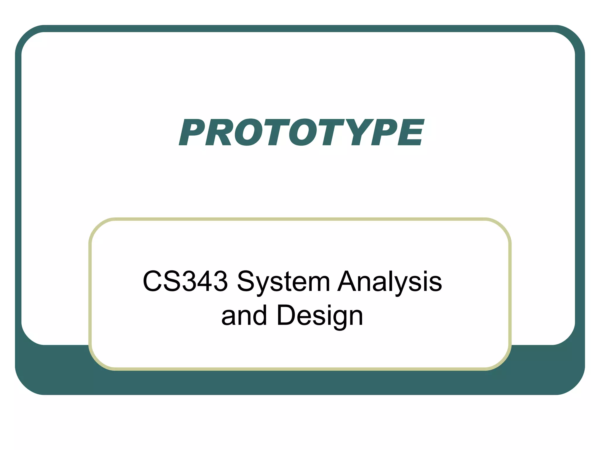 There are several types of prototypes that can be used in systems analysis and design including patched-up prototypes, nonoperational prototypes, first-of-a-series prototypes, and selected features prototypes. Prototypes allow users to interact with and provide feedback on early versions of a system to help identify requirements, innovations, and needed revisions before significant resources are spent on development. Prototyping is best for systems that are uncertain or unstable, while established systems with certain requirements are less suitable for prototyping.