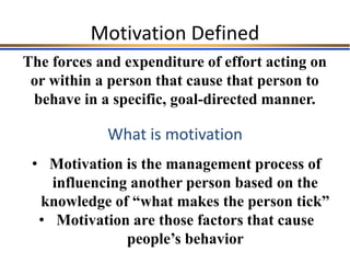 The document discusses various theories and models of motivation. It begins by defining motivation and examining the relationship between motivation and performance. It then outlines several need-based models of motivation including Maslow's hierarchy of needs, Herzberg's two-factor theory, and McClelland's acquired needs theory. Process models of motivation such as the expectancy model, equity theory, and goal setting are also summarized. The document concludes by examining contemporary approaches to motivation and prescriptions for improving motivation.