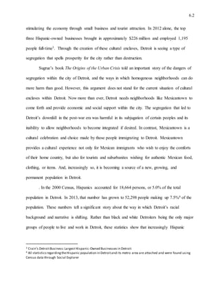 Detroit's narrative is evolving from a traditional black-white binary to include a significant Mexican population contributing to the city's cultural and economic revitalization. Cultural enclaves like Mexicantown are thriving, providing jobs and attracting both locals and tourists, while the Hispanic population continues to grow. However, challenges remain, particularly regarding the treatment of immigrants, which could threaten the community's development and the broader revitalization of Detroit.