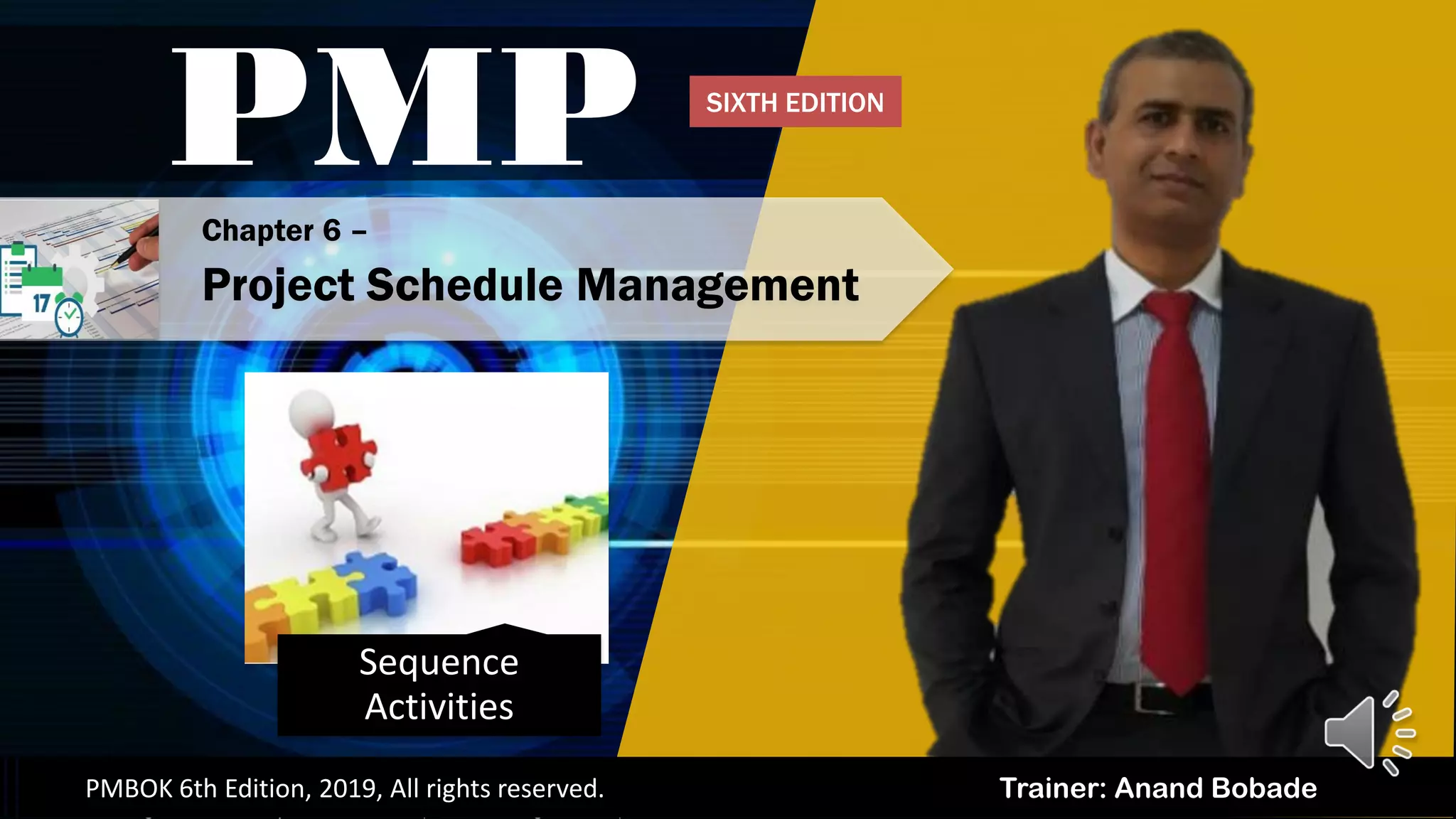 The document discusses the process of sequencing project activities from the Project Management Body of Knowledge (PMBOK) 6th edition. It describes identifying and documenting relationships among project activities to define the logical sequence of work for greatest efficiency. Key tools include precedence diagramming, dependency determination, leads and lags, and project management information systems to develop the project schedule network diagram showing activity sequences and relationships. The outputs are the updated project schedule network diagram and project documents.