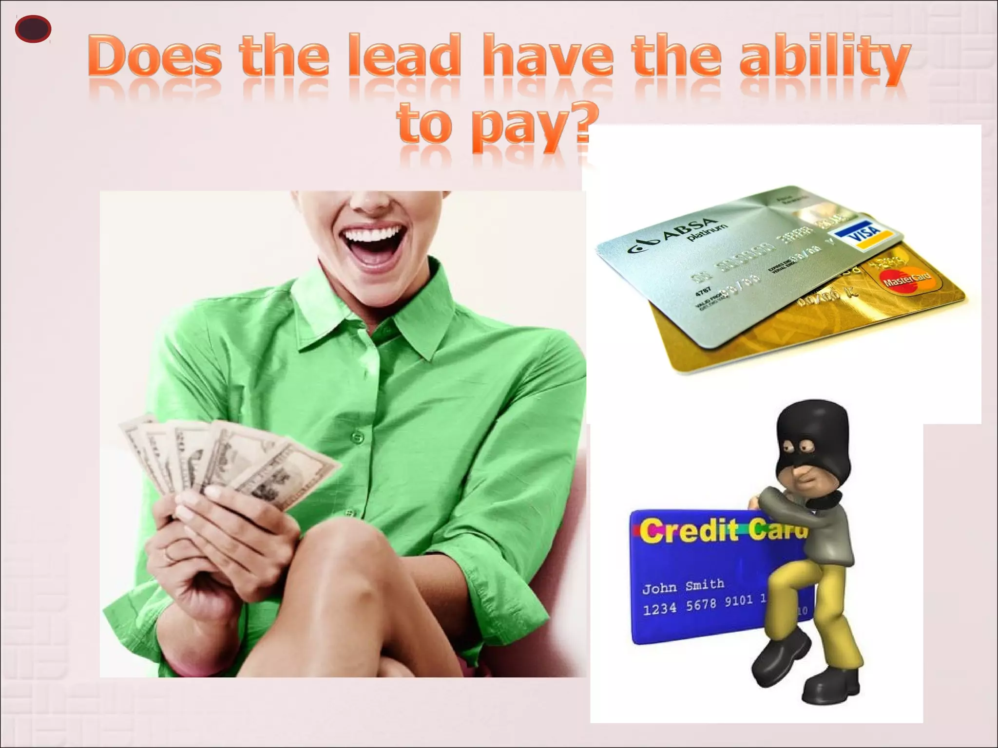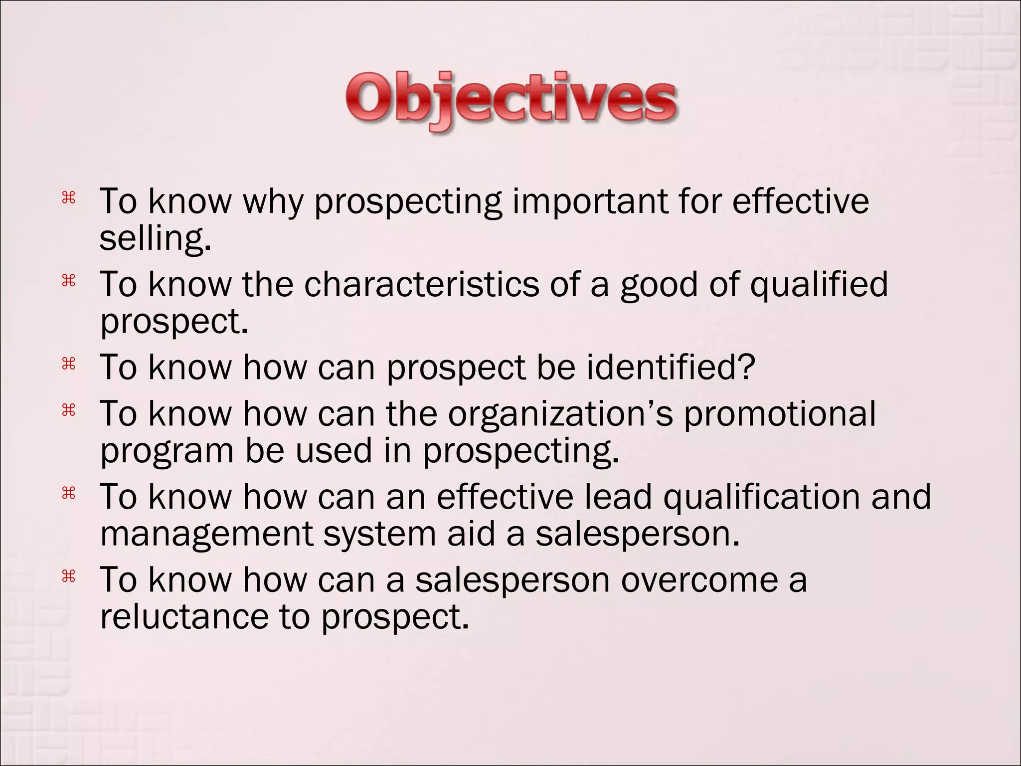 This document discusses various methods for identifying qualified sales prospects, including utilizing satisfied customers for referrals, networking, identifying centers of influence, internet prospecting, trade shows, seminars, and researching public directories. It emphasizes that not all leads will qualify as prospects and outlines factors to consider like need, ability to pay, authority to buy, accessibility, and eligibility. Effective prospecting is important for sales success.
