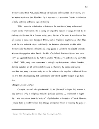 The document discusses the ongoing revitalization of Detroit with comparisons to Chicago's recovery from post-industrial decline, emphasizing the importance of education, a creative economy, and public transportation. While downtown Detroit experiences growth and attracts young people, significant blight remains in other neighborhoods, leading to a disparity between residents. The need for improved public transportation and regional cooperation to ensure inclusivity in revitalization efforts is highlighted as crucial for the city's future competitiveness.