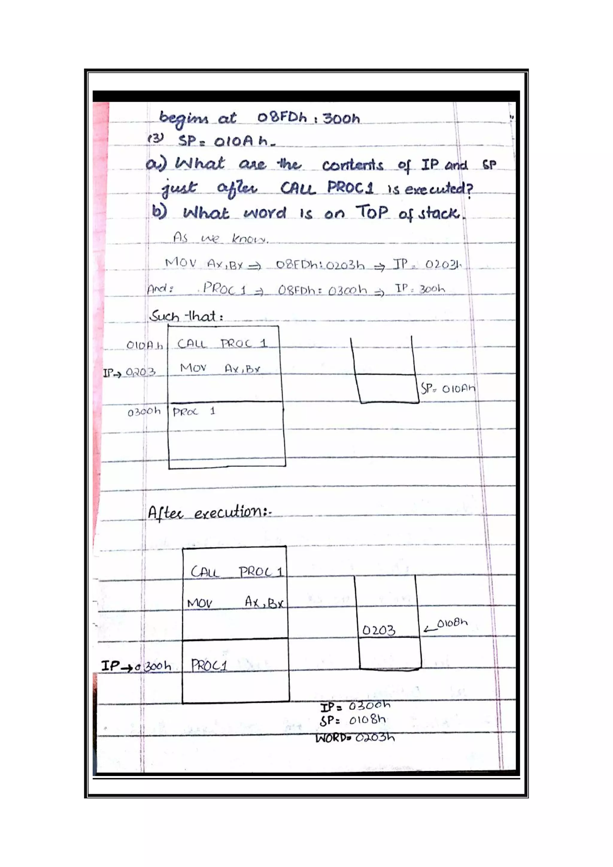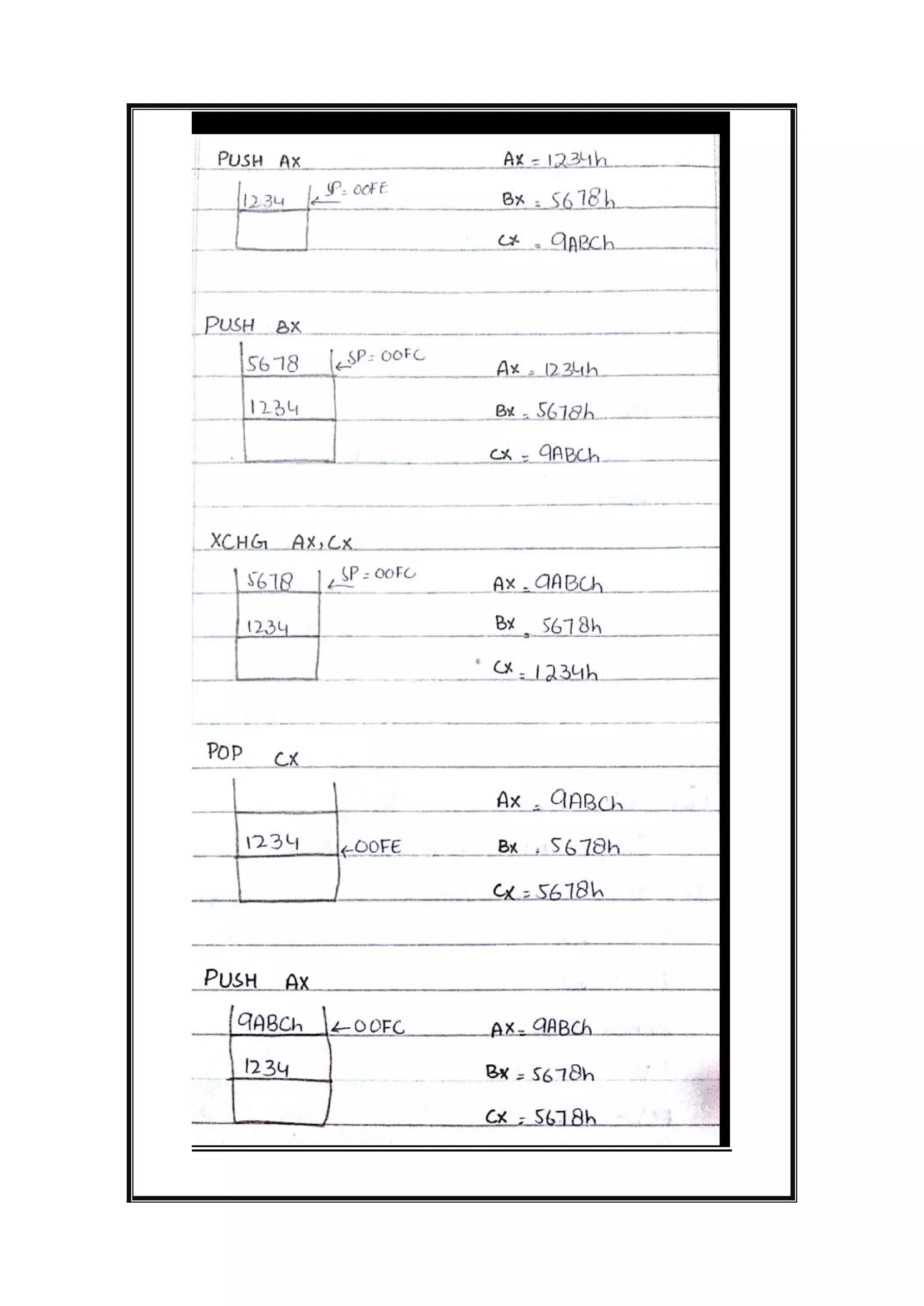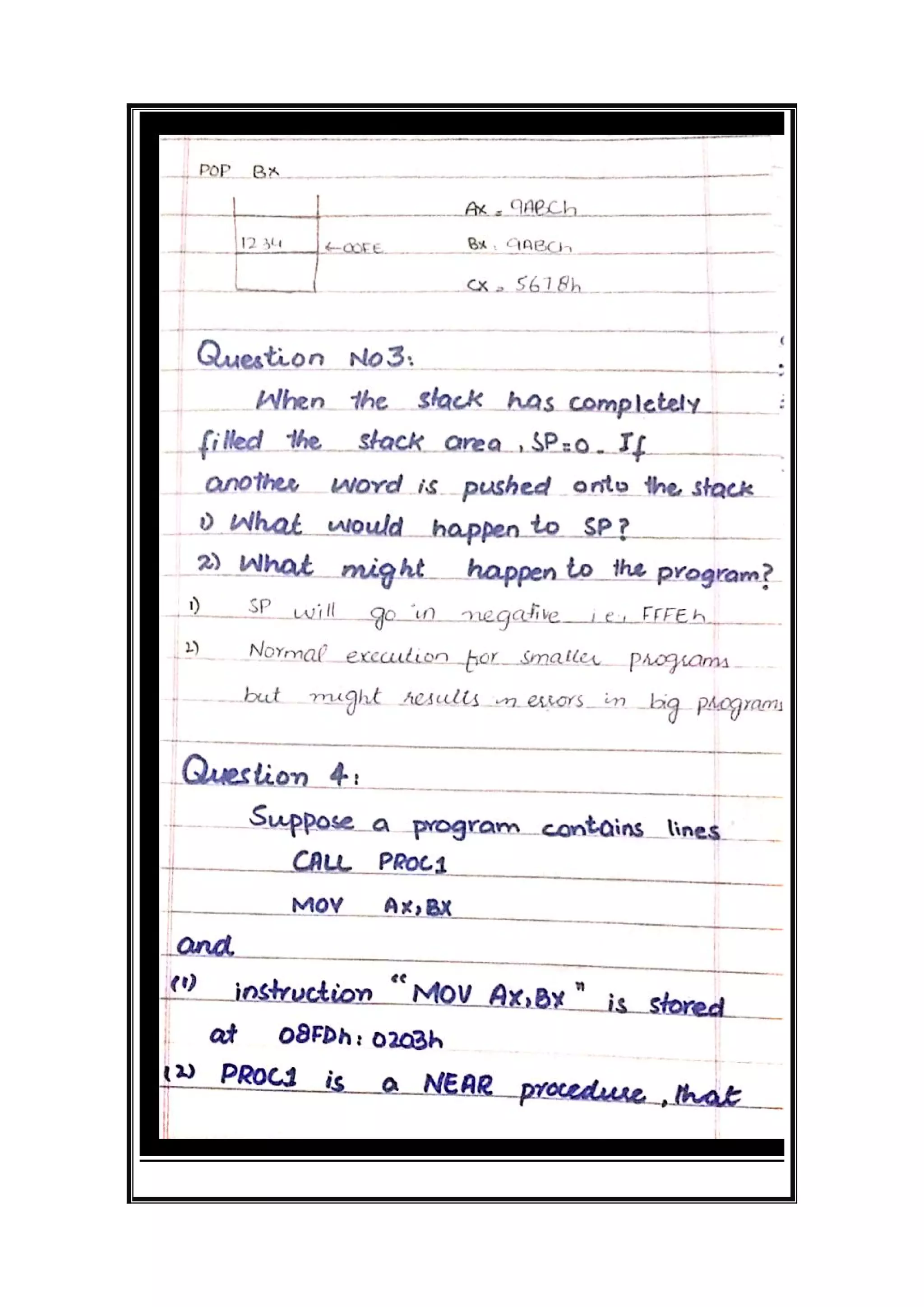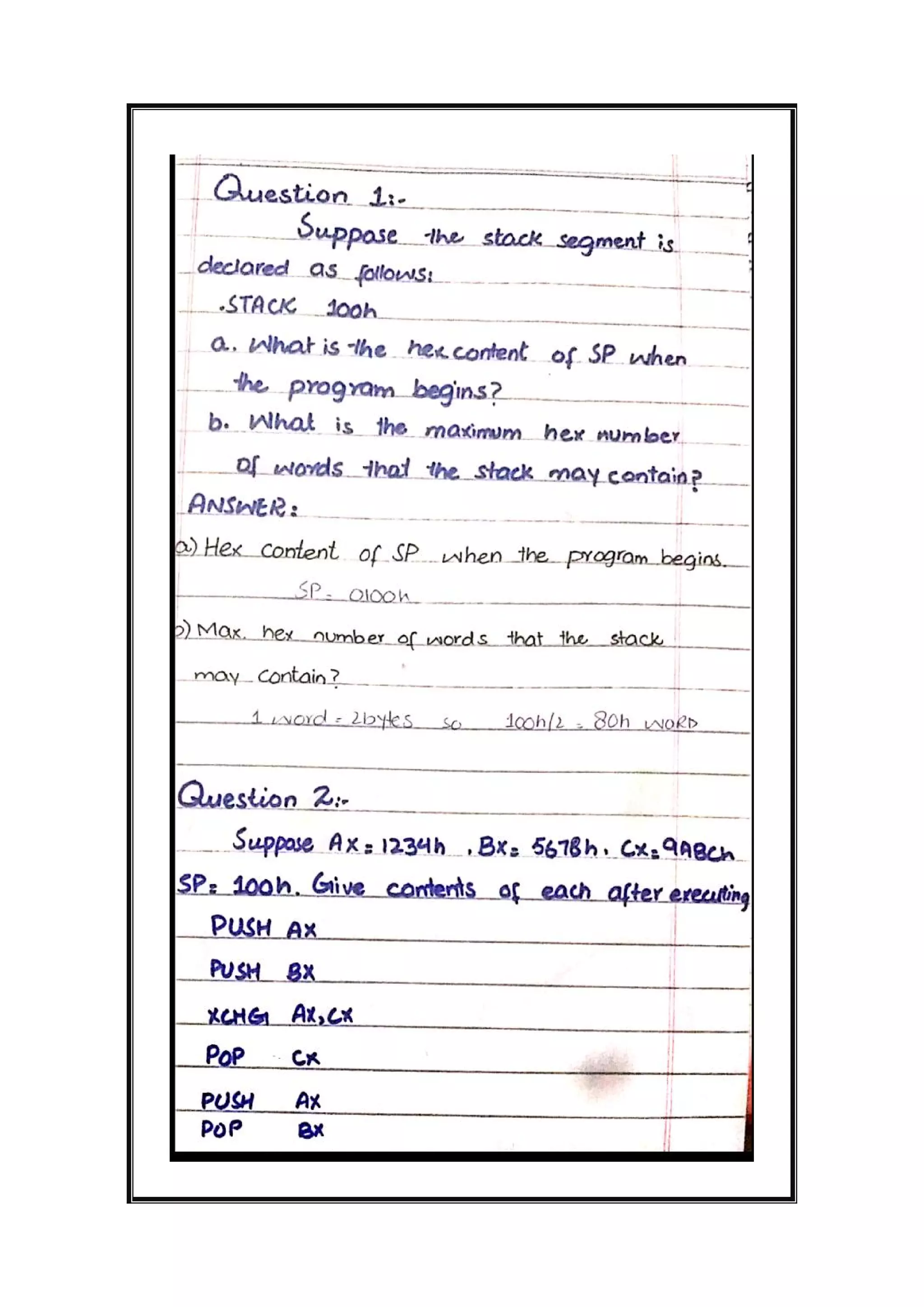The document is a solution manual covering assembly language programming focusing on stack management and multiplication/division instructions. It provides detailed answers and code solutions to various questions related to stack operations and arithmetic computations on the IBM PC. Key topics include procedures for saving and restoring registers, as well as executing multiplication and division instructions with specific register values.