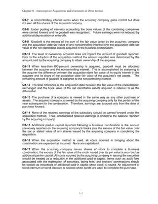 The document discusses intercorporate acquisitions and investments in other entities. It provides answers to 22 questions on topics such as the purposes of forming new subsidiaries, different types of business combinations, accounting for acquisitions, goodwill, and international harmonization of accounting standards. Specifically, it addresses how assets are transferred between entities, when consolidation is required, how goodwill is calculated and allocated, the differences between pooling and purchase accounting methods, and concerns companies have regarding international accounting standard differences.