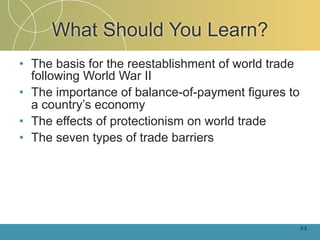The document discusses the dynamic environment of international trade, including the establishment of major global trade organizations like the WTO and GATT following World War 2 to reduce trade barriers. It covers topics like balance of trade, protectionism, trade barriers, and the roles of the IMF and World Bank in facilitating international trade and development.