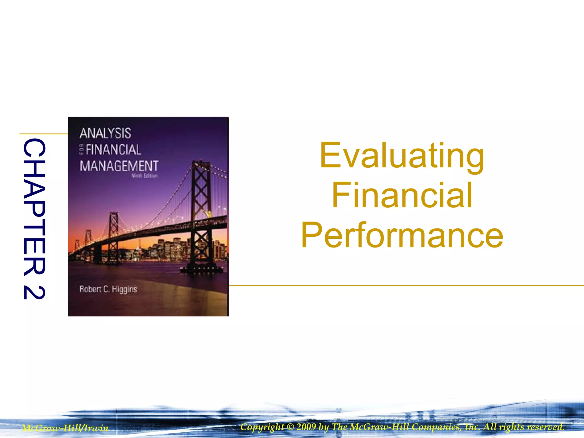 This document provides an overview of key financial performance metrics such as return on equity (ROE), return on assets (ROA), profit margin, asset turnover, and financial leverage. It discusses how these metrics can be used to evaluate and compare the financial performance of different companies. Tables of example data on multiple companies are presented to illustrate the concepts.